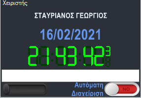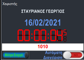 Στο κάτω μέρος της λωρίδας αυτής υπάρχει η ημερομηνία και η ώρα η τρέχουσα. Το λευκό πλαίσιο είναι για να γράψουμε τον Κωδικό Συστήματος Συνδρομητή για να δούμε το ιστορικό σημάτων ή για να φορτώσουμε την καρτέλα του. Στην κάτω γωνία δεξιά υπάρχει η επιλογή Αυτόματης Διαχείρισης όπου και επιλέγουμε αν θέλουμε το πρόγραμμα να αναδύει αυτόματα την καρτέλα διαχείρισης εισερχόμενου συμβάντος.